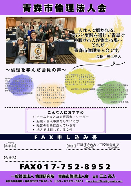 (チラシ裏面の申込書をご利用ください)主催: 青森市倫理法人会(会長:三上 亮人)