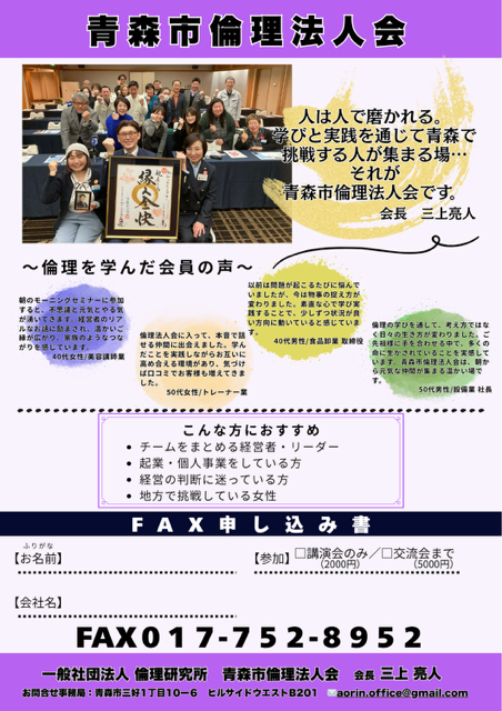 (チラシ裏面の申込書をご利用ください)主催: 青森市倫理法人会(会長:三上 亮人)
